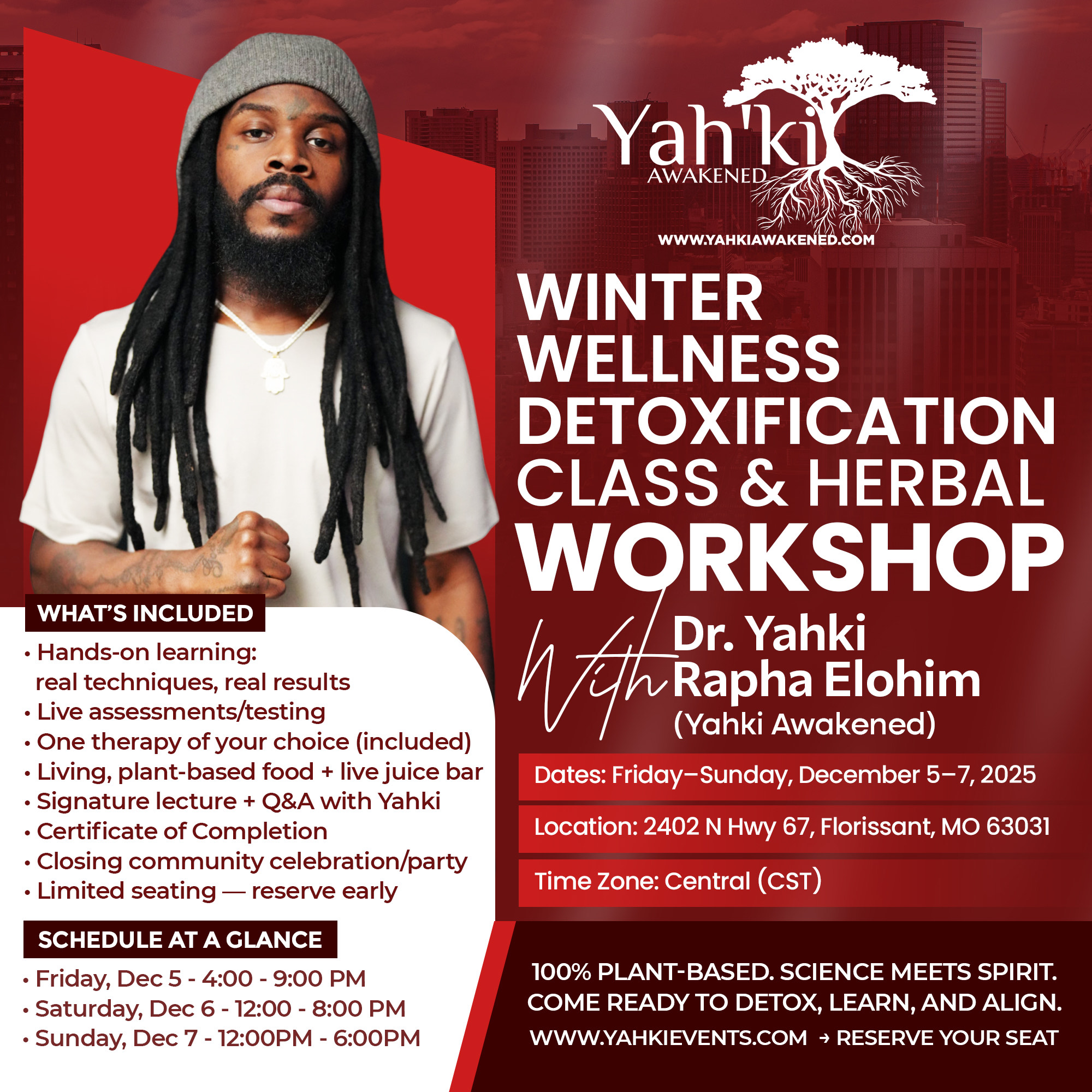 Join Dr. Yahki Rapha Elohim, Ph.D., H.C. at the Winter Wellness Detoxification Class & Herbal Workshop in St. Louis, MO Friday, December 5 – Sunday, December 7